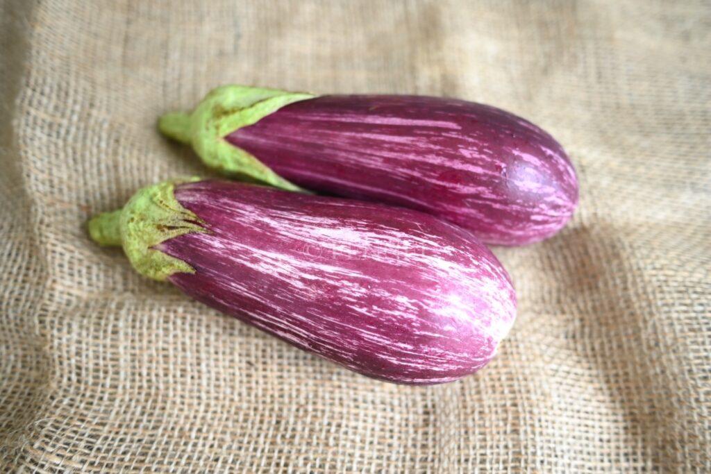 ゼブラ模様の長なす。加熱するとトロトロになり美味です。緻密で食感しっかりしてます。輪切りにして炒めたり、パスタなどに。また素揚げすると皮の色が鮮やかになり、彩りを楽しめます。