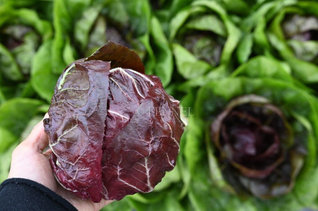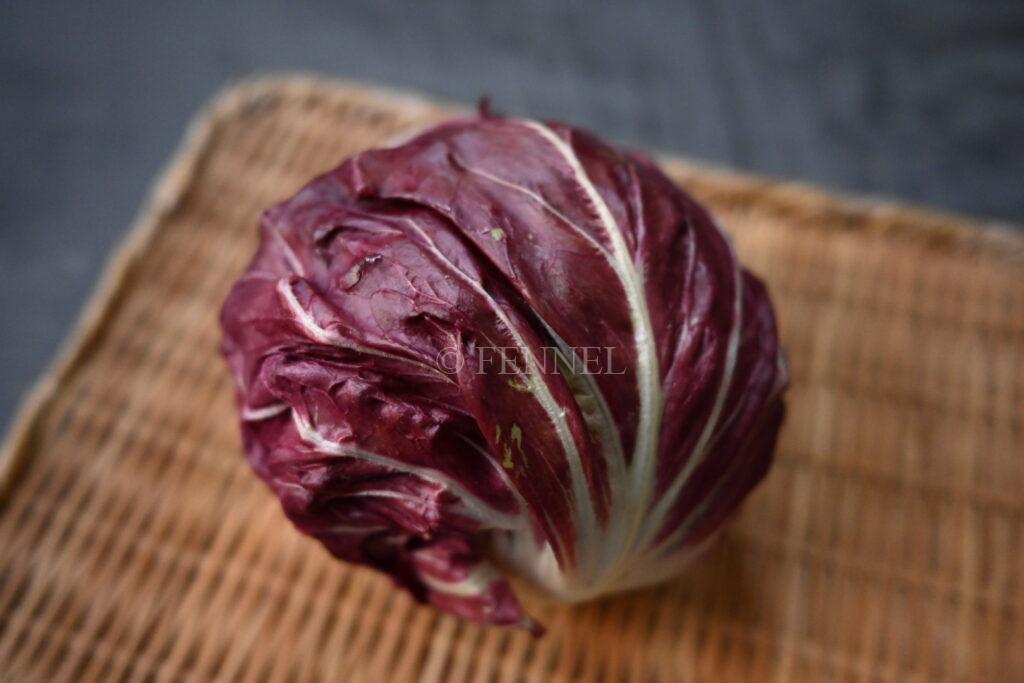 英名「トレビス」。鮮やかな赤と白のコントラスの赤チコリ。サラダに加えるときは流水にさらすと苦みがマイルドに。あとはしっかりとオリーブオイルでコーティングして召し上がってください。グリルも◎